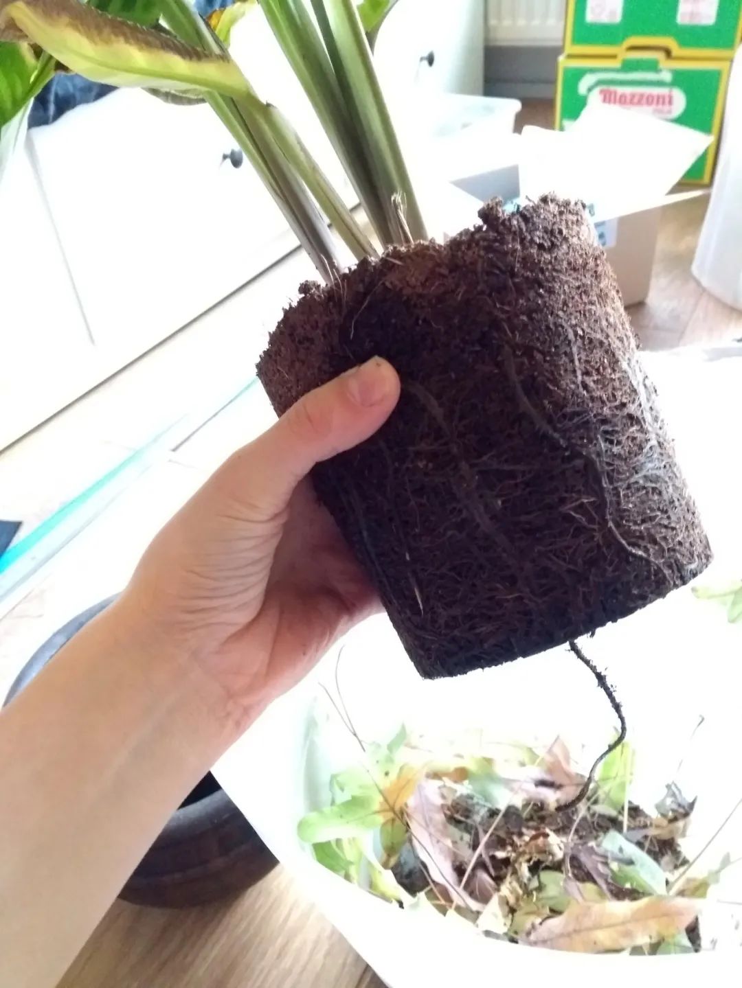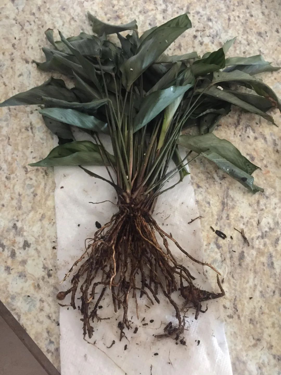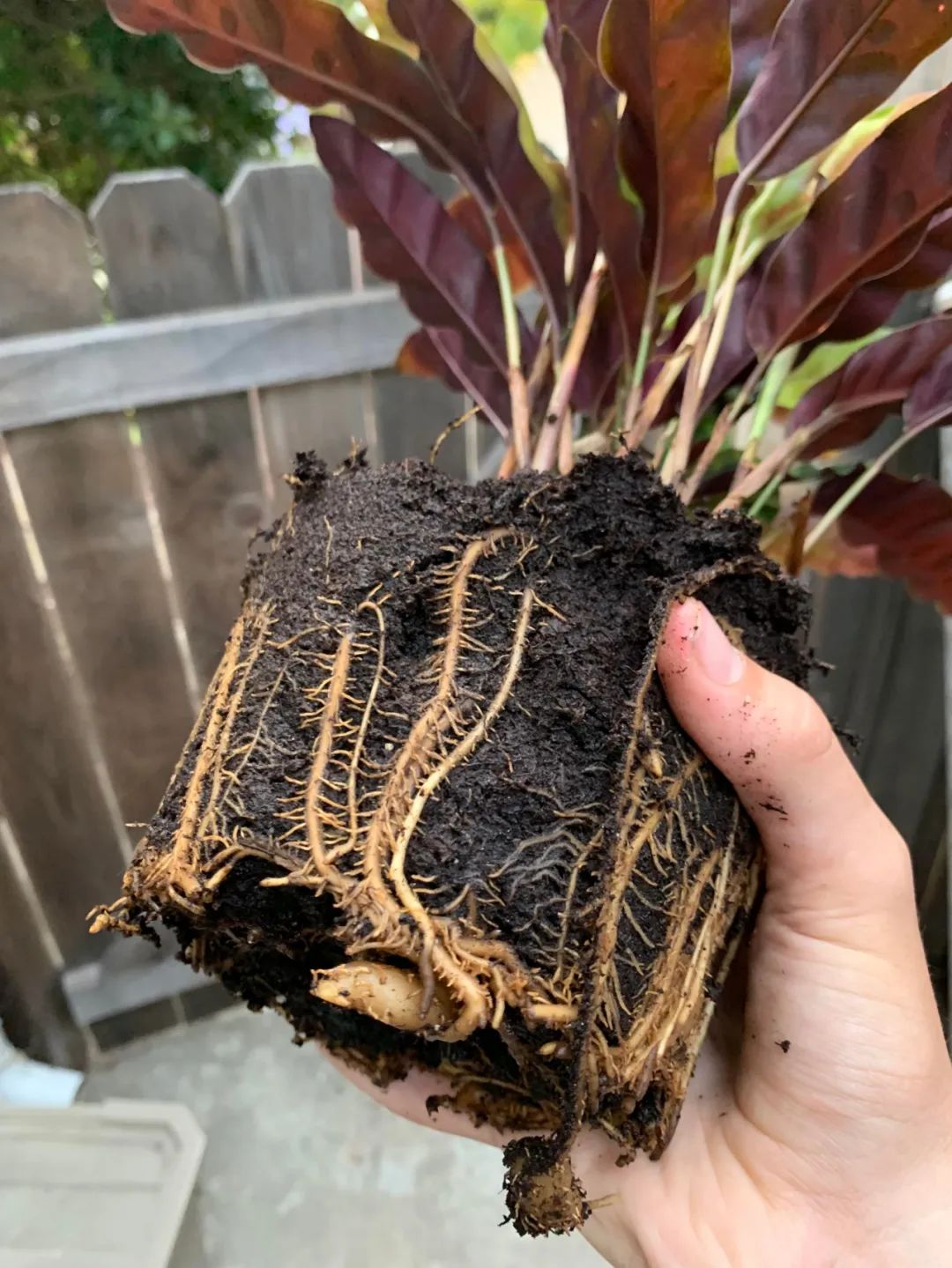 在前一天浇过水的观赏竹芋,直接抓住根茎底部,花盆倾斜,就可以轻松的将整棵植株拔出来,去掉根部周围松散的土壤,小心地将根分开。