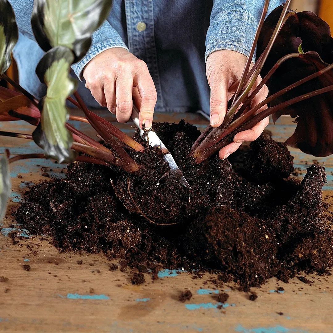 接着我们就可以仔细查看观赏竹芋底部的分蘖,并且用手指轻轻的将土壤拨开。有一些分蘖长得特别健壮,是可以直接用手掰开的,如果根部长得比较密集,则可以用锋利的刀子切割,刀子在切割前要预先消毒,不过一般都是建议用手掰开。