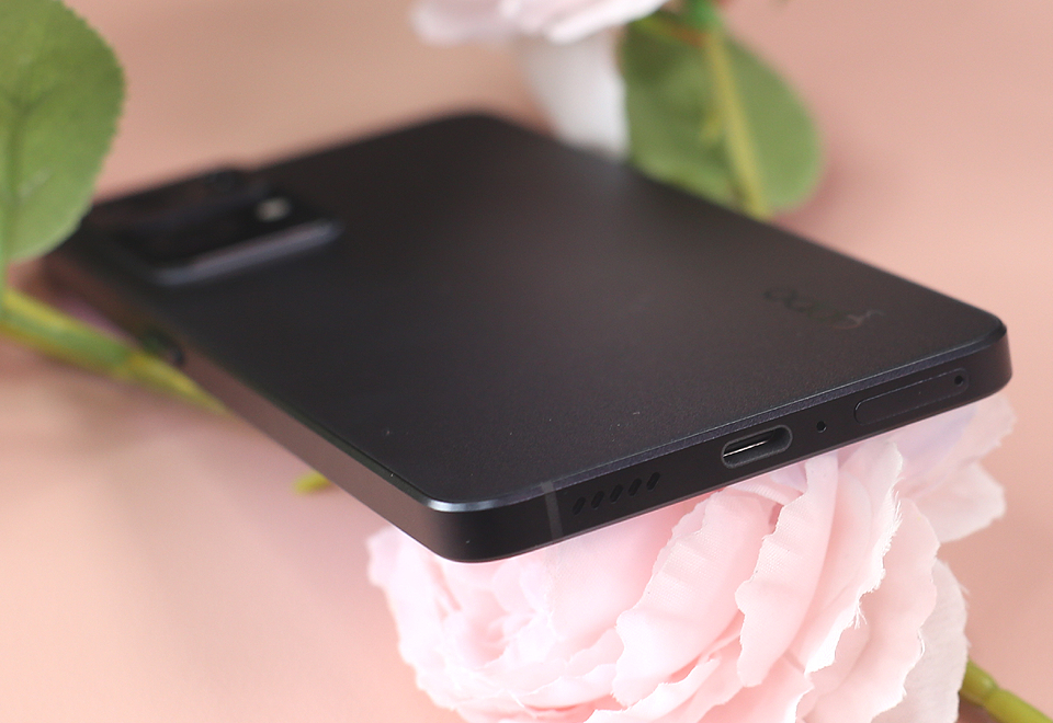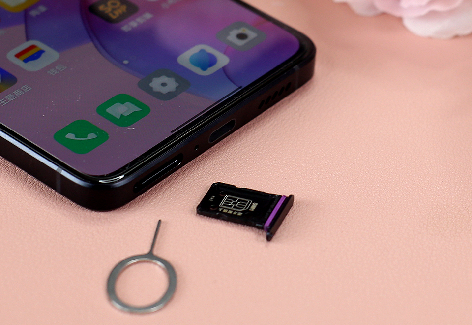 机身顶部边框上带有两条对称的信号带,而底部与则带有SIM卡卡槽、降噪麦克风开孔、Type-C接口以及扬声器孔。