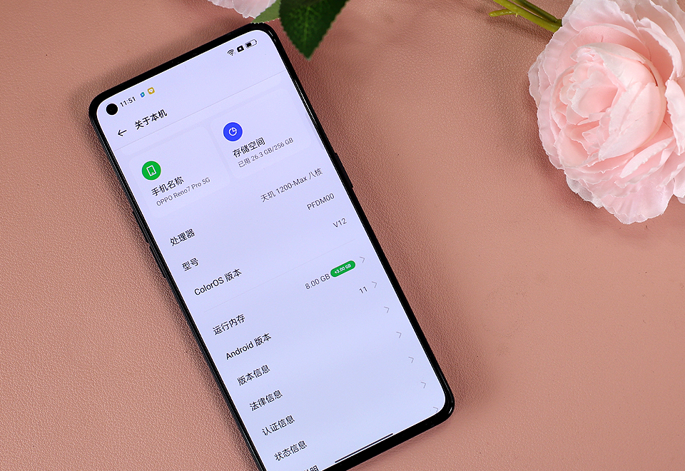 性能部分,OPPO Reno7 Pro 搭载了天玑 1200-MAX 旗舰芯片以及 UFS3.1 闪存、最高 12GB+256GB 大内。
