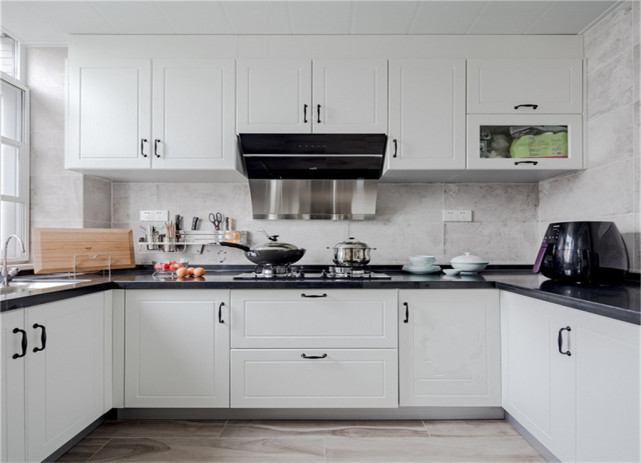 厨房看上去应该干净、整洁,我们需要合理地安排出收纳的空间。可以在吊顶的下面打造一些吊柜,另外吊柜与操作平台之间的间隙也可以利用起来,易于放取一些烹饪中所需的用具,有的还可以作为简易的卷帘门,避免小电器落灰尘。