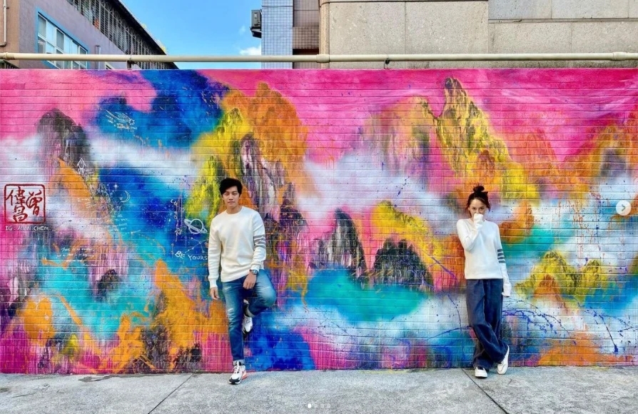 陈乔恩Alan穿情侣装秀恩爱 趴巨大壁画墙上搞怪合影