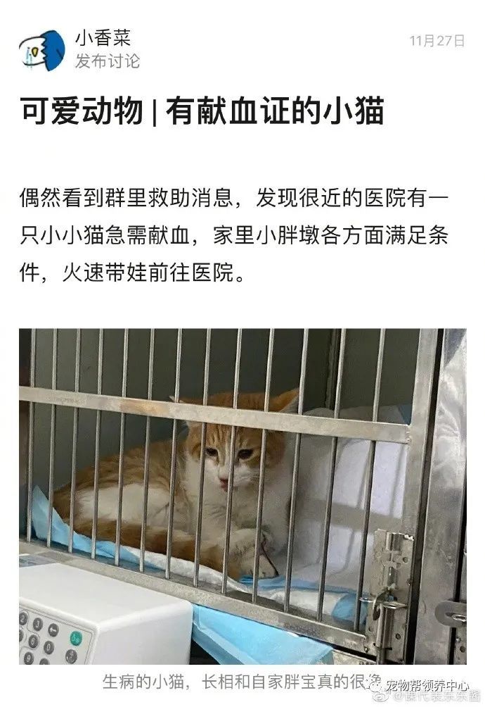 她偶然在群里看到了救助消息,发现很近的医院有一只小小猫急需献血,而她家里的小胖墩各方面满足条件,她火速带娃前往医院。