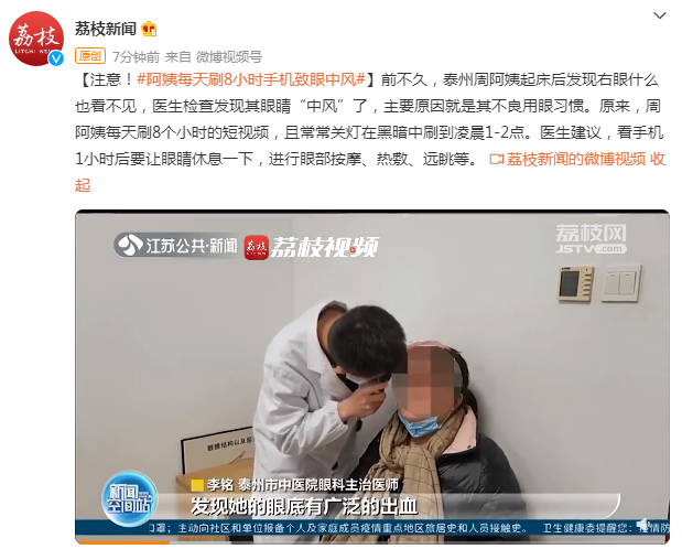 【注意!#阿姨每天刷8小时手机致眼中风#】前不久,泰州周阿姨起床后发现右眼什么也看不见,医生检查发现其眼睛“中风”了,主要原因就是其不良用眼习惯。原来,周阿姨每天刷8个小时的短视频,且常常关灯在黑暗中刷到凌晨1-2点。医生建议,看手机1小时后要让眼睛休息一下,进行眼部按摩、热敷、远眺等。