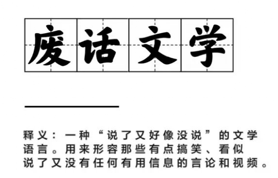 所谓“废话文学”,是用来形容那些有点搞笑,看似说了又没有任何有用信息的言论和视频,也形容一些模棱两可、打太极、绕圈圈的话,现作为一种网络流行语被广泛使用。因此,咱们也可以把“废话文学”与“发疯文学”、“凡尔赛文学”联系到一起,他们都属于在网络交流中所诞生的新颖的、反常规的语言表达方式。