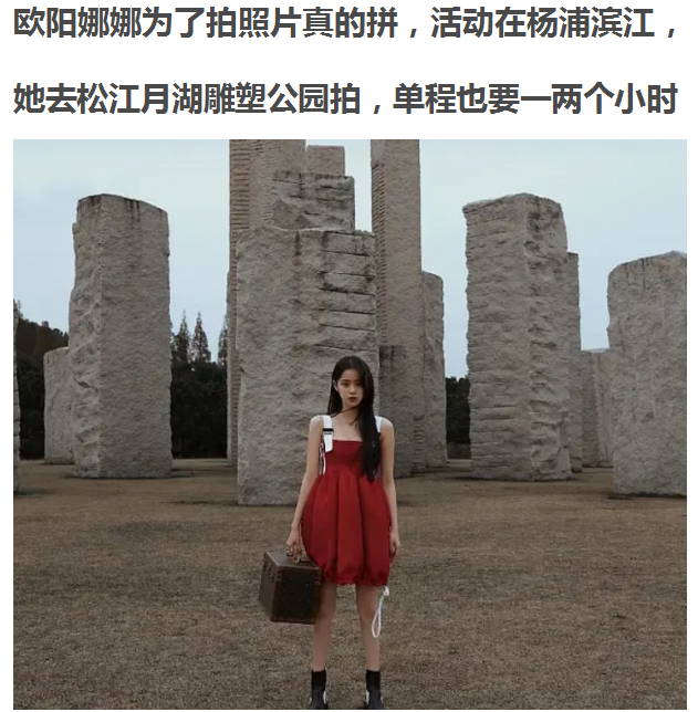 某高奢品牌红毯开场前,欧阳娜娜跑到了近50公里外的雕塑公园拍图,来回都要3小时,真的很努力了。
