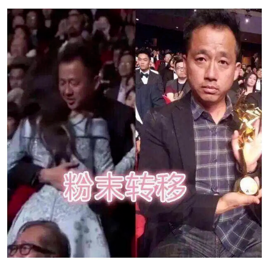 亚洲电影大奖上,范冰冰也将自己身上涂的粉底,分享到了好友的黑西装上。