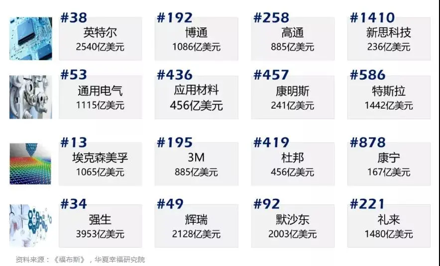 在基础电子信息领域,他们有英特尔;IC设计领域,他们有博通、高通、英伟达;基础装备领域,他们有通用电气;新材料领域,他们有杜邦、3M、康宁……