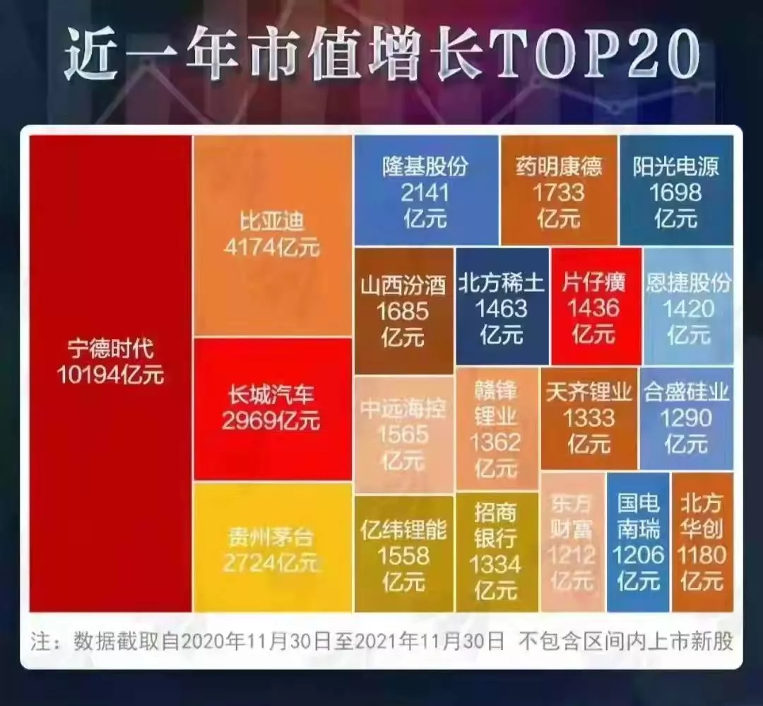 你会发现,近一年市值增长最多的20家上市公司里,前三全部属于新能源汽车相关领域。排在第一位的宁德时代,更是一年暴增10194亿元,一举成为最靓的仔。号称“A股之王”的贵州茅台,在如此凌厉的攻势之下,也只能夹着尾巴屈居第四。