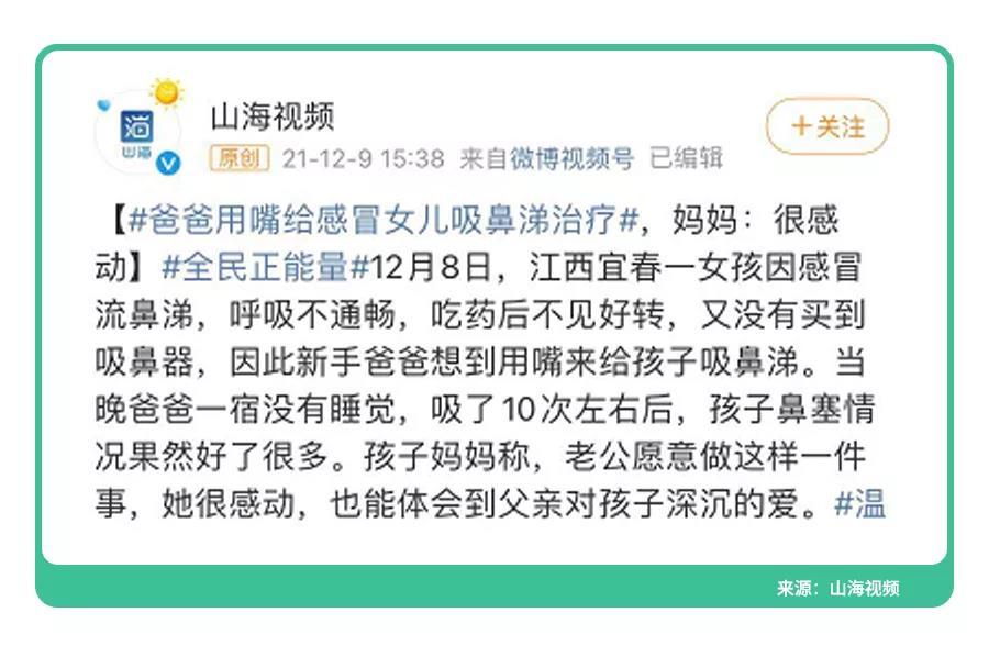 “父亲用嘴给女儿吸鼻涕治疗”这个新闻大家看过吗?