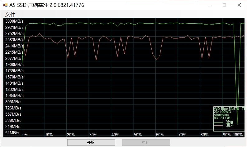 AS SSD Benchmark的压缩率数据测试中,WD Blue 7的读取速度也比较平滑,写入有些波动,不过这也比较正常。