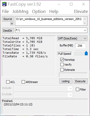 在硬盘测试软件FastCopy中,模拟平时实际文件拷贝的情况,测试从其它固态硬盘向WD Blue SN570传输一个5.7GB的文件,可以看到平均传输速度为1739MB/s,用时共3.3秒。