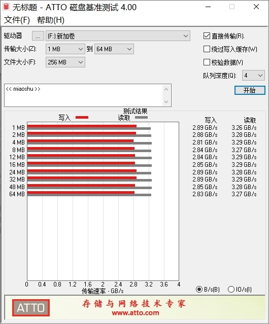 ATTO磁盘基准测试中,从1MB的小文件到64MB的较大文件,WD Blue SN570的读写都比较稳定,读速基本在3.3GB/s左右,写速则在2.8GB/s左右。