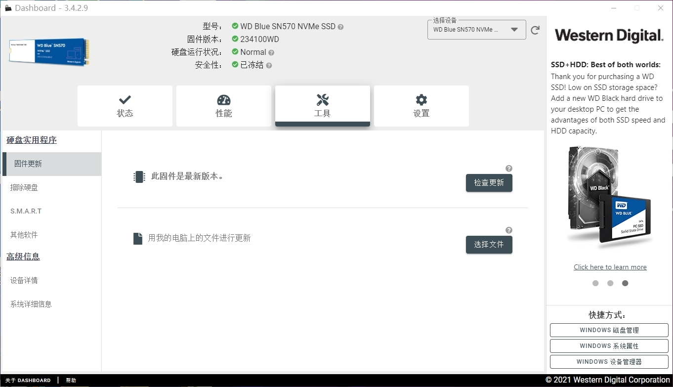 西数提供了“Western Digital SSD 仪表板工具”这款固态硬盘管理和维护软件,可以全方位监控SSD健康/运行状况,除了固件更新、擦除硬盘等功能,还提供了驱动器克隆的软件。