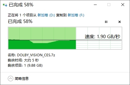 楼主也用大文件进行了拷贝测试,从别的盘向WD Blue SN570拷入数据,写入速度约1.9GB/s,说明了使用WD Blue SN570拷贝大文件相当快速,平时拷贝个游戏啥的也是几秒钟的事。