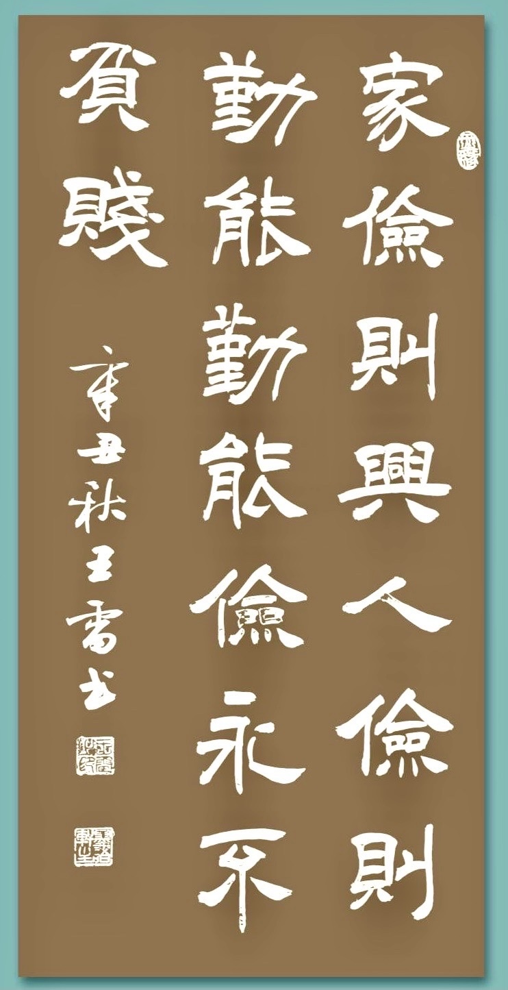 文宗秦汉,楷法晋唐,王雷尊崇古人书法,坚持传统书法,三十年如一日,勤习不辍,这是现代书者难得可贵之处,是书法界一股清流,王雷在书法教学上也取得了显著成绩,荣获国家级高级培训名师荣誉。