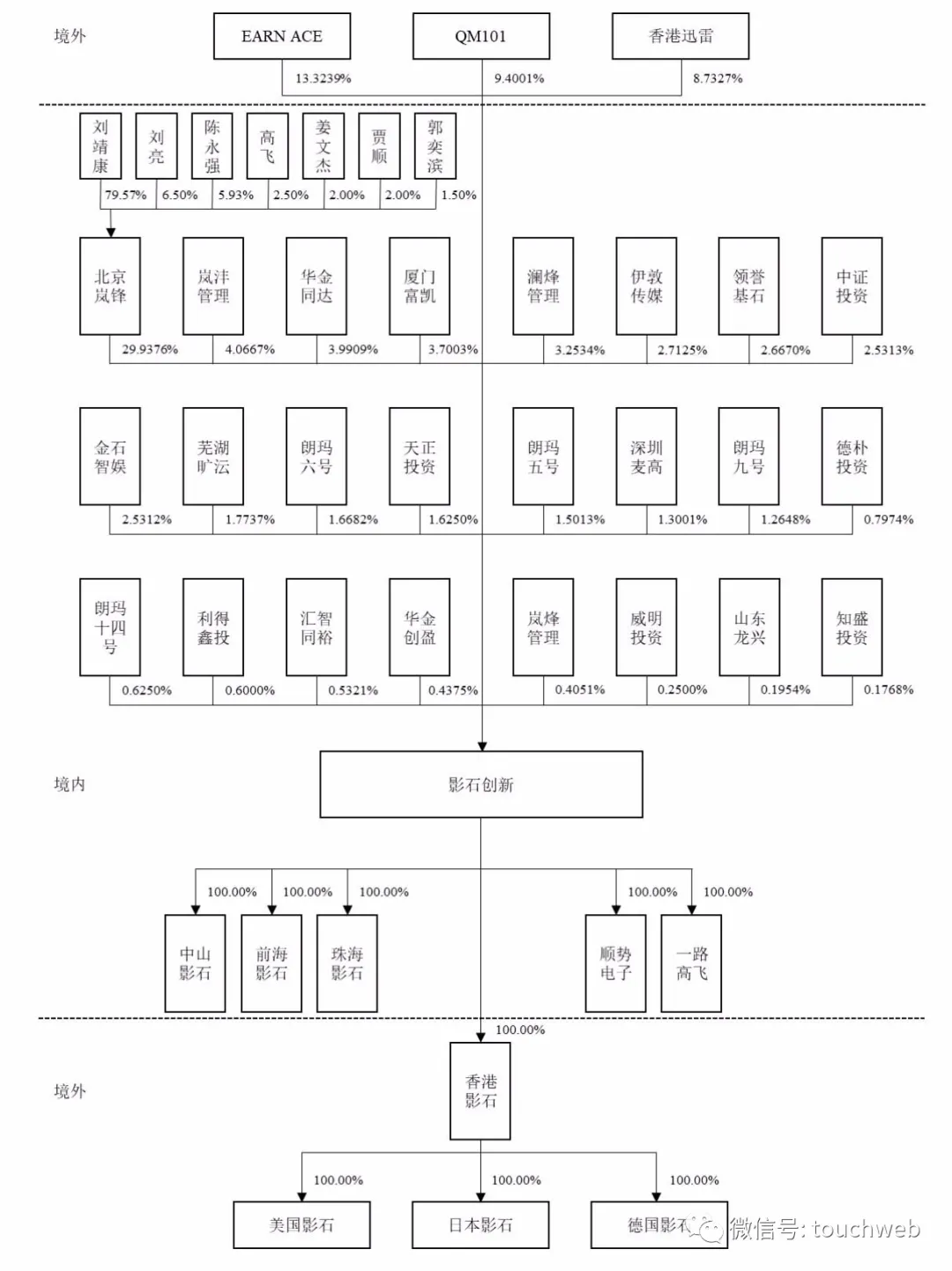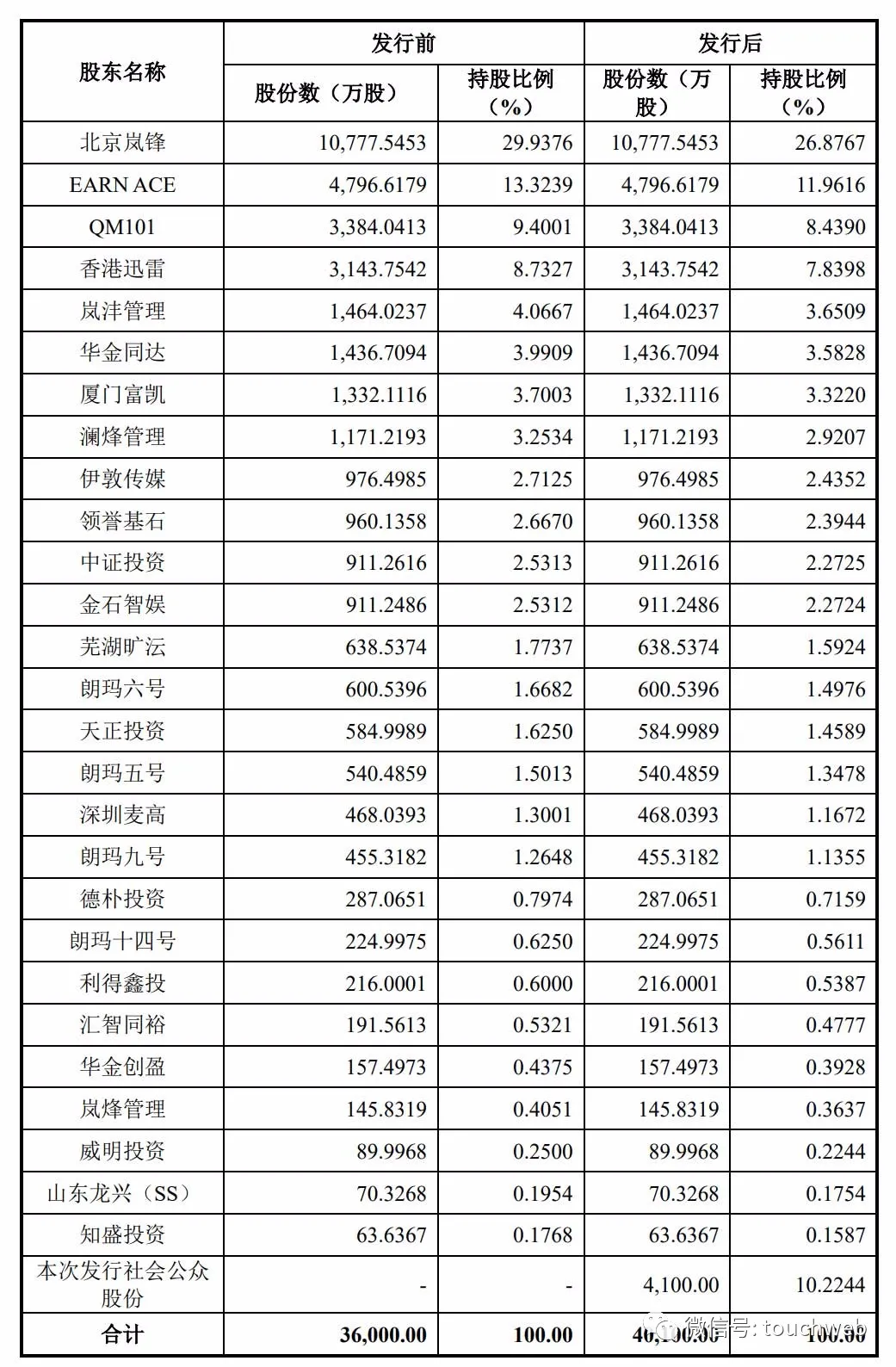 IPO后,北京岚锋持股为26.8767%,EARN ACE持股为11.9616%,启明旗下QM101持股为8.4390%,香港迅雷持股为7.8398%,岚沣管理持股为3.6509%,华金同达持股为3.5828%,厦门富凯持股为3.3220%;