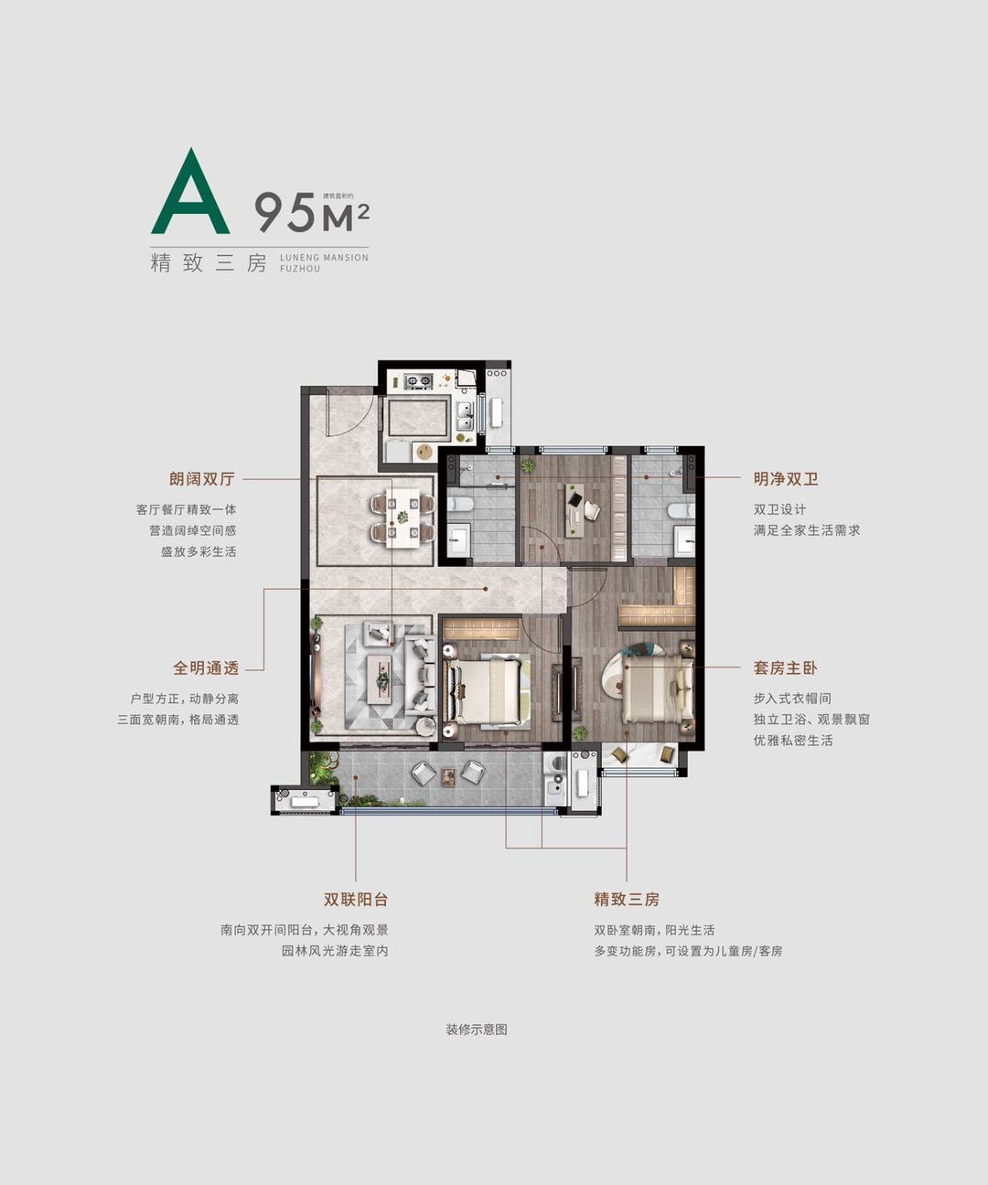 鲁能公馆三期A户型,建面约95㎡,属于中间户,三房两厅两卫设计,户型方正,动静分离,全明采光,三开间朝南,属于当前市面上主流的三房户型。