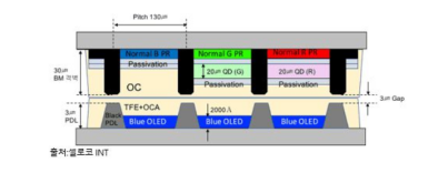 如今,三星借助QD-OLED卷土重来。QD-OLED是以蓝光OLED为底光,然后激发红色、绿色量子点膜,形成红光和绿光,最后与蓝光OLED一起形成RGB。其中蓝光OLED采用蒸镀工艺,绿色、红色量子点膜采用印刷工艺。与RGB OLED相比,QD-OLED方案只有蓝光OLED需要蒸镀,降低了制备的难度。与LG Display WRGB OLED(WOLED)相比,三星Display QD-OLED发光效率更高。
