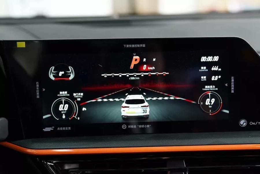 驾驶模式中的赛道模式非常带感,当你切换至赛道模式时,中控屏将显示油门开度、加速度、涡轮压力以及海拔和坡度等更多信息,在这个价位区间,百公里加速最快为7.79s也算是同级领先水准了。
