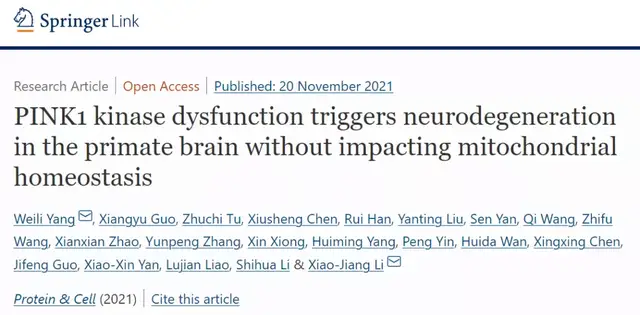 2019 年,他们开始在 PINK1 敲除猴子模型上继续试验,并在 Cell Research 杂志上发表研究。研究证明,PINK1 敲除猴子脑部出现了严重的神经细胞变性和死亡,而已有报道 PINK1 敲除小鼠无明显神经细胞死亡。该团队一直在探究为何敲除 PINK1 基因后两种模型的表现形成鲜明对比?