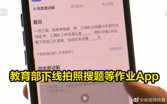 【#教育部下线拍照搜题等作业App#】#拍照搜题App不同身份搜索结果无差异#13日,教育部官网发布消息,已印发通知,要求加强教育App管理,推动与“双减”政策衔接,暂时下线“拍照搜题”类作业App。通知明确提出,对于提供和传播“拍照搜题”等 惰化学生思维能力、影响学生独立思考、违背教育教学规律的不良学习方法的作业App,暂时下线。整改到位并经省级教育行政部门审核后,方可恢复备案;未通过审核的,撤销备案。13日下午,记者在手机应用商店搜索发现,主打“拍照搜题”的App种类繁多,并且仍旧可以下载。记者随机下载其中一款,并尝试对一道六年级数学题进行拍照搜题,两三秒钟之后,就可以得到题目答案。 记者还发现,在使用部分“拍照搜题”App之前,会有学生、老师、家长3种不同身份选择;记者先后尝试不同选择,但结果并无差异。 http://t.cn/A6x8WT1W