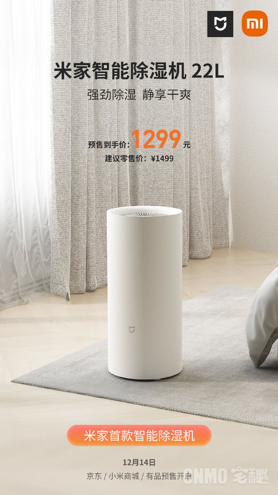 【宅秘新闻】米家智能除湿机22L已于日前在小米商城上架。12月14日,小米官方宣布,米家智能除湿机22L正式开启预售,建议零售价1499元,预售到手价1299元。根据介绍,该除湿机日除湿量可达22L,采用五重降噪设计,噪音低至35.5分贝,并有三种工作模式,可满足多种需求。