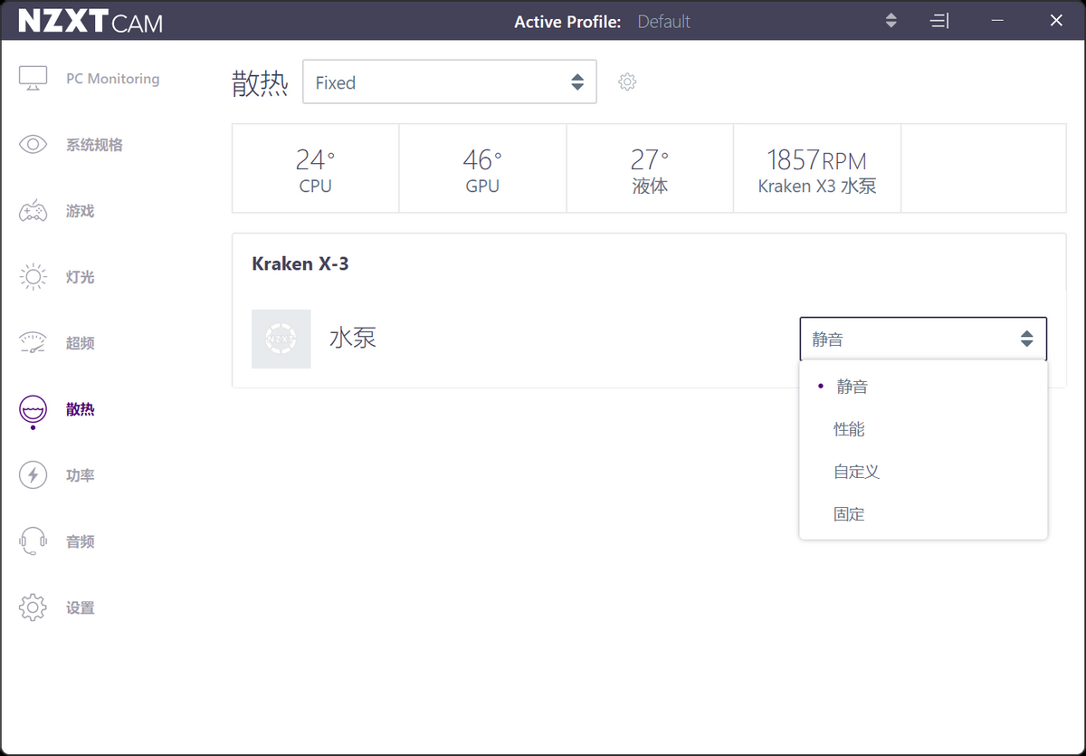 为了测试这款水冷的散热性能,我们将NZXT Kraken X63 RGB安装在一个i9-12900K搭建的英特尔12代测试平台,使用AIDA64只勾选FPU压力测试以获得最大且稳定的处理器发热量,进行为时20分钟的考机温度测试。在NZXT CAM软件中提供了静音、性能、固定和自定义四种散热模式,不过这只影响日常使用时的风扇调度,CPU满载情况下的性能是一样的。