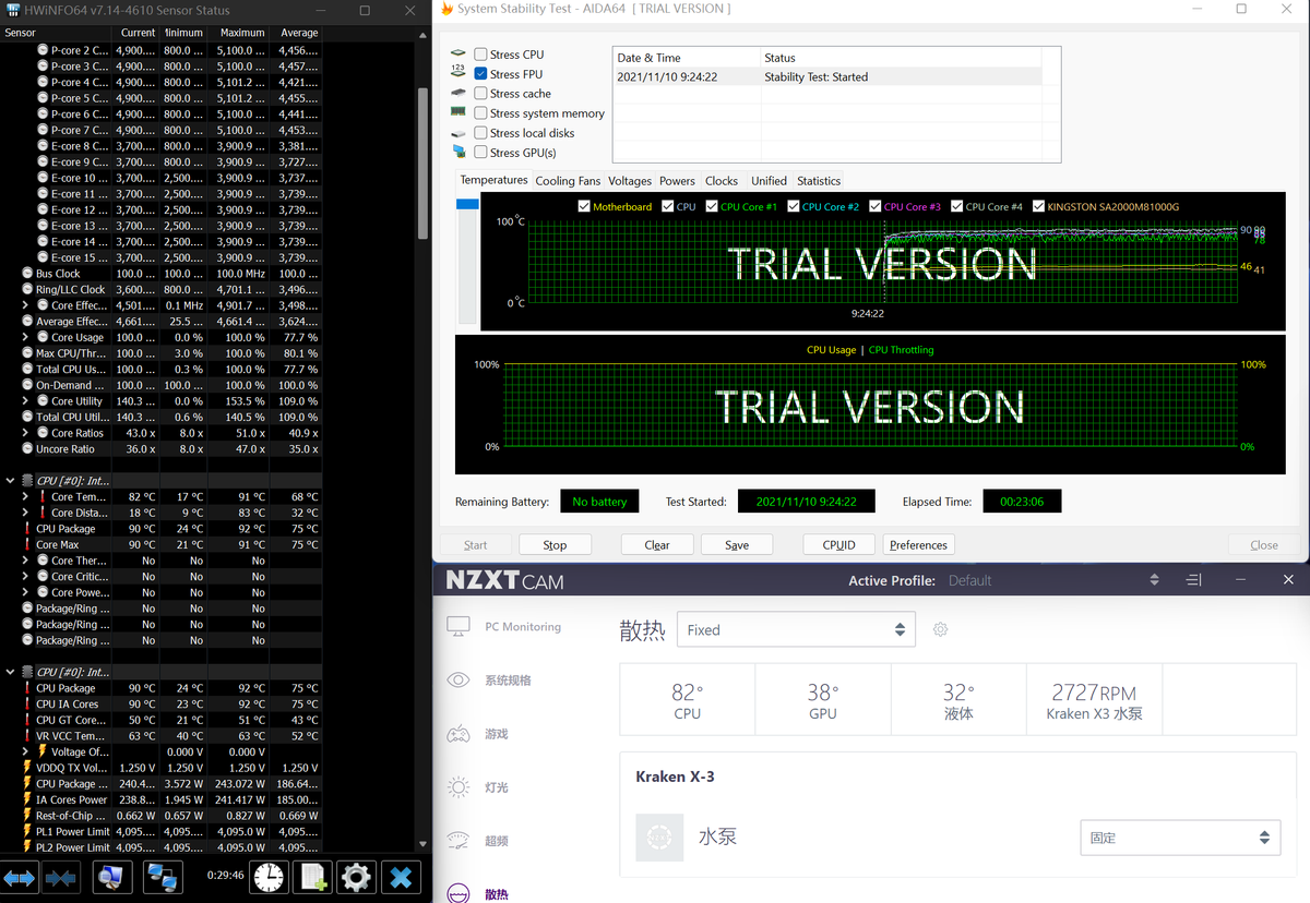 测试时,我们手动将风扇和水泵转速拉到最大,在室温为23.8℃的办公室中,考机20分钟CPU封装温度为90℃,此时CPU功耗在240W左右,其中P核、E核分别稳定在4.9GHz和3.7GHz。通过NZXT的CAM控制软件,可以看到这时候水冷液的温度为32℃,也是很低的温度水平,说明积热基本都被排出去了,满载状态下的散热及噪声表现都比较不错。而在默认的静音模式下,它的静音效果完全和240水冷拉开了差距,运行时几乎听不到风声,并且在这个转速下140风扇也能轻松吹透冷排,待机温度仅为28℃。