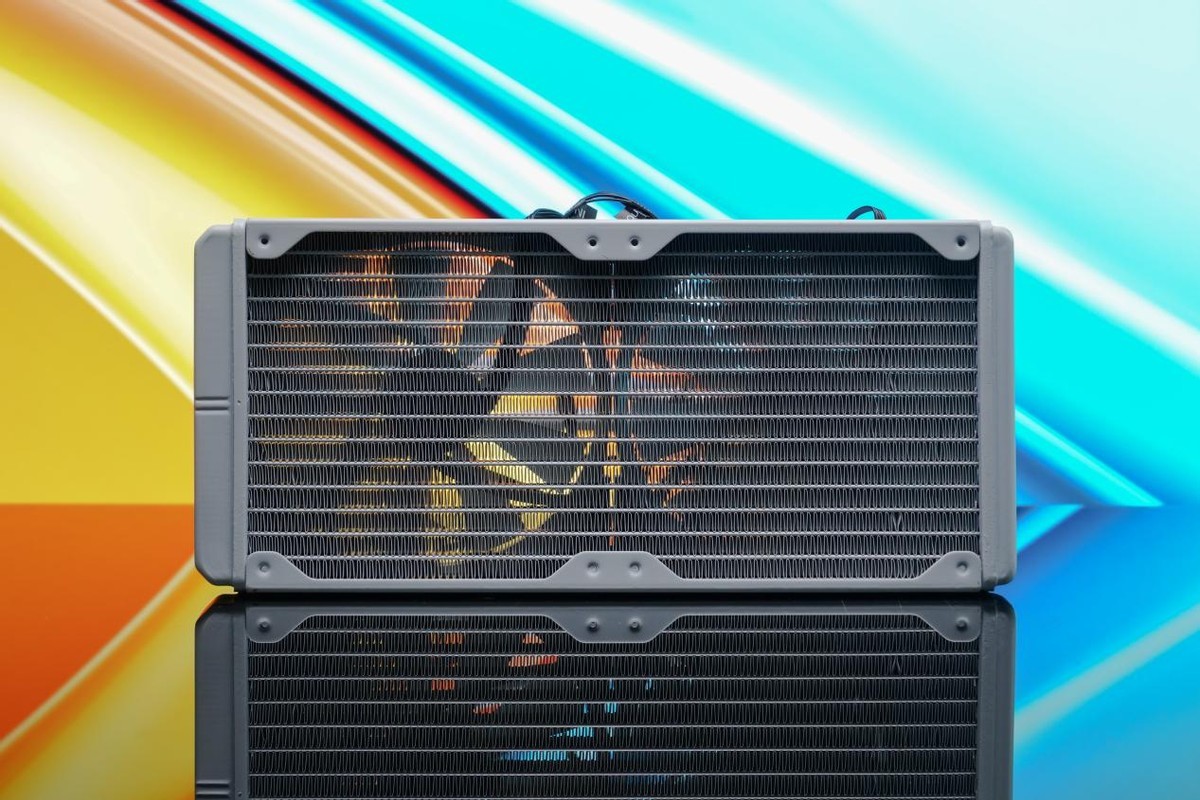 冷排上配备了2把Aer RGB 2 140风扇,扇叶周围框架上有RGB灯环,同样可以通过CAM软件控制灯效。风扇搭载了FDB液态轴承,在扇叶边缘采用了倒角进气口,主打耐用和静音。风扇转速为500~1500RPM(±300RPM),拥有最大91.19 CFM的风量表现,在转速不变的情况下,最大风量上要比Aer RGB 2 120风扇好上太多,这使得280水冷的风扇能以更低的转速运行,相较于240水冷拥有比较明显的静音优势。