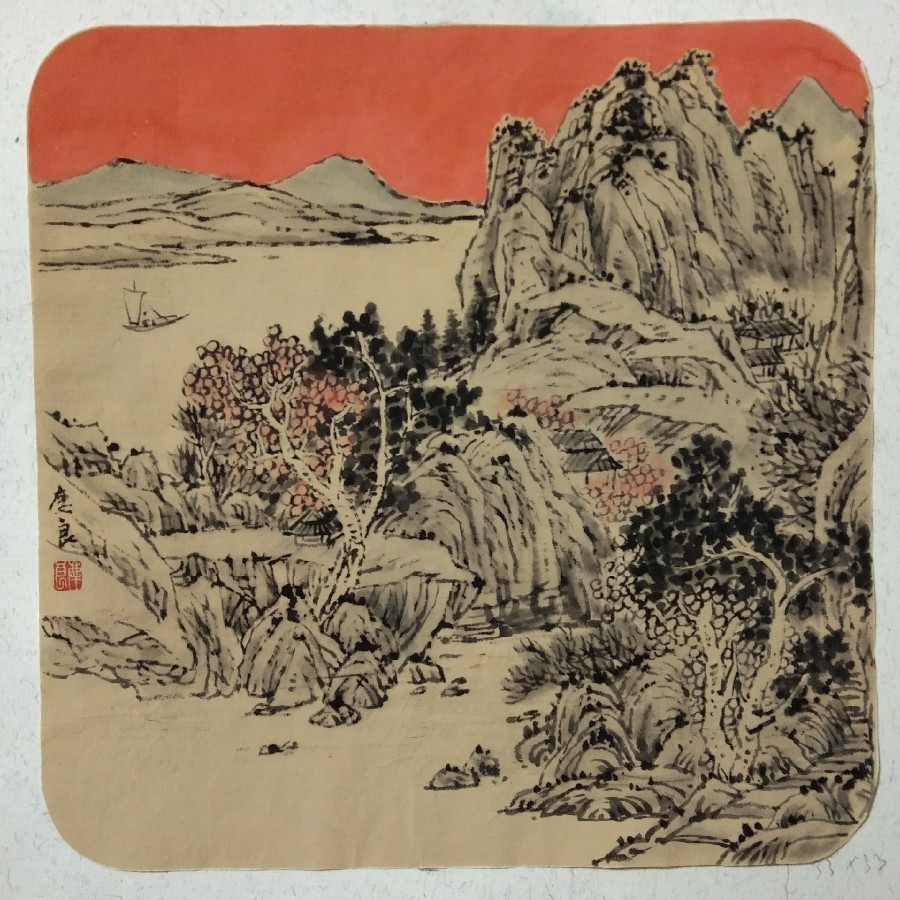 作品讲述:《唐人诗意》这幅小品是以传统山水绘画为主的题材。山石、树木都以传统勾、皴、点、染来完成。远山之后的背景以重彩红色来突显这幅作品的新意,使画面的层次感更强。