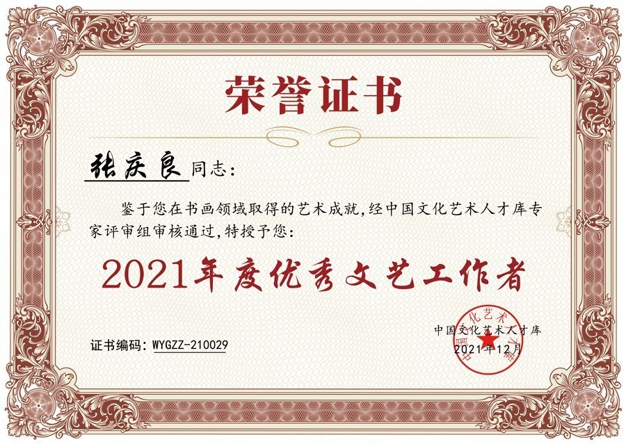 鉴于画家张庆良同志在艺术领域取得的优异成就,经中国文化艺术人才库专家评审组审核通过,特授予其“2021年度全国优秀文艺工作者”荣誉称号。