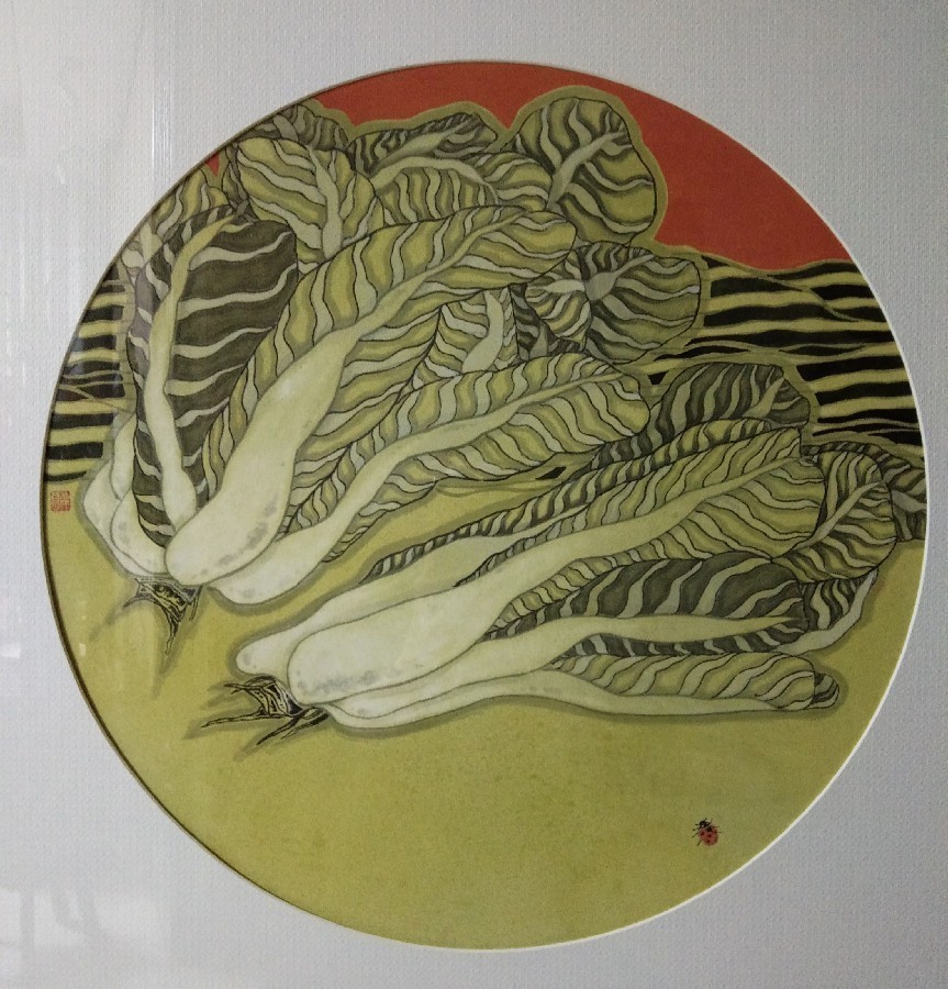作品讲述:《 清白》这幅作品是以《蔬果系列》之一的白菜为题材。脱离了传统的一般绘画技法,运用意象的手法把白菜的本质特征突显出来,以矿物红色为背景并用自己以黑白条纹为代表的粗布为衬托,使整个画面与众不同,给人以全新的视角。
