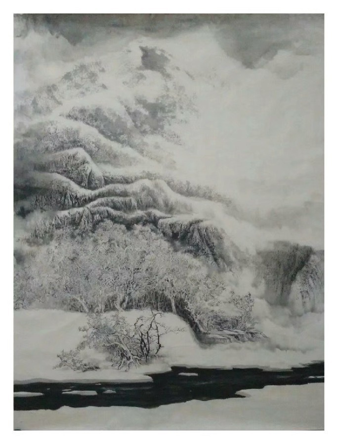 作品讲述:《静谧》是单以水墨为主,运用了先泼后描的技法进行描绘,重点层层深入。表现隆冬时节漫天皆白,银装素裹的雪景。周围一片静寂,近处小河弯弯曲曲流向远方,远处这些雪雾霭霭轻笼着黄昏,萦绕在山间时虚时幻,仿若仙境,这景使人醉目。