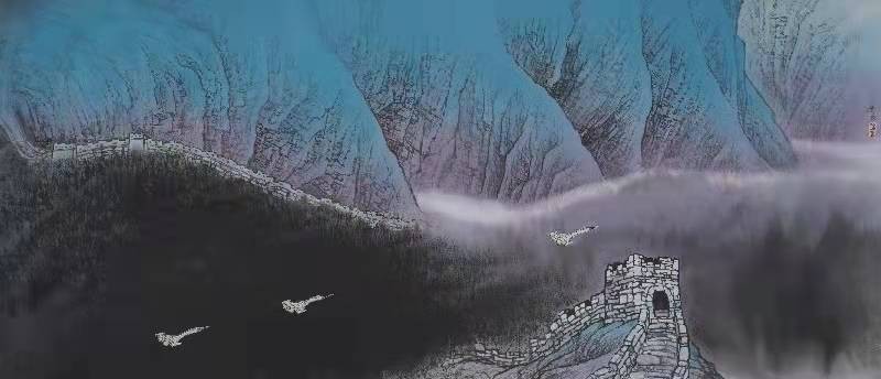 作品讲述:《国之使命》以蓝、黑色调为主色调。上半部山川以石青色层层晕染,即作为背景又体现山川的层次感。右下方为长城以墨色衬托,下半部云山以浓淡泼墨墨色为主,整体画面既沉稳又厚重。几架战斗机由左下角向右上角形成一线,使构图画面产生丰富的变化。自古有万里长城捍卫疆土,跨越千年后的今天为实现中华民族伟大复兴,国家的综合实力不断增强,拥有更强大的军事力量来捍卫国疆。在祖国的蓝天下有搏击长空的战斗英雄们保驾护航,为真正实现我们中华民族伟大复兴而奋斗!