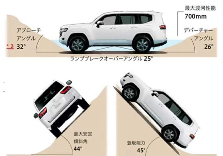 作为陆巡来说,在国内最好的莫过于它的口碑,以及其强大的越野性能,上述电子系统肯定不足以展现其性能,最基本的还在于一些车身硬素质,LC300拥有700MM的涉水深度,接近角32度离去角44度,最小离地间隙也是达到了235MM,相比国内炙手可热的坦克500来说它的接近角之后29.5度离去角也只有24度,对于极限路况,爬坡等情况来看,高下立判。