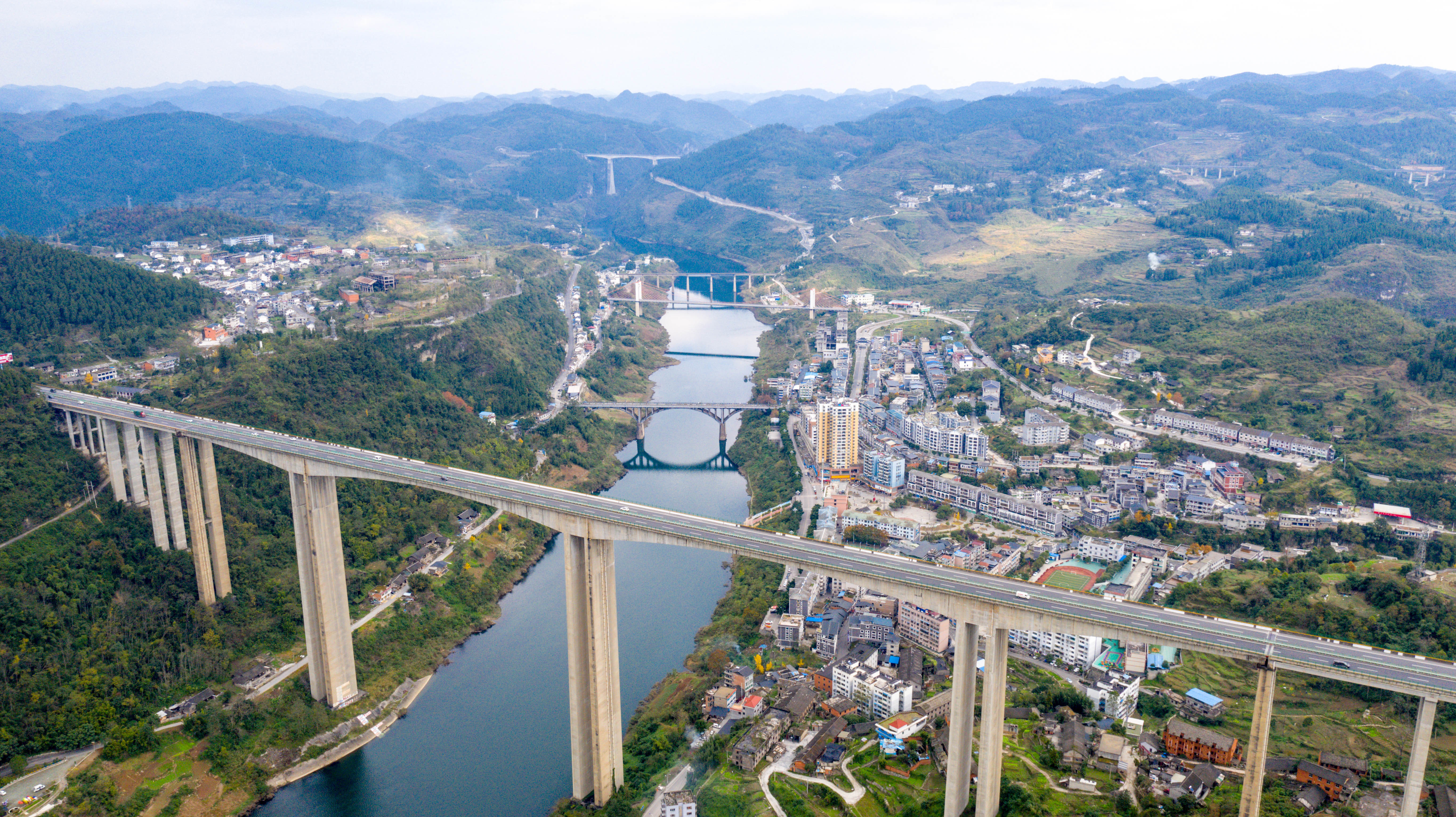 11月24日拍摄的贵州省乌江特大桥。在贵州省遵义市乌江镇不到两公里范围内,建设有横跨在乌江之上的五座桥梁。五桥飞渡的壮丽景观见证了贵州桥梁的发展史(无人机照片)。新华社记者 欧东衢 摄