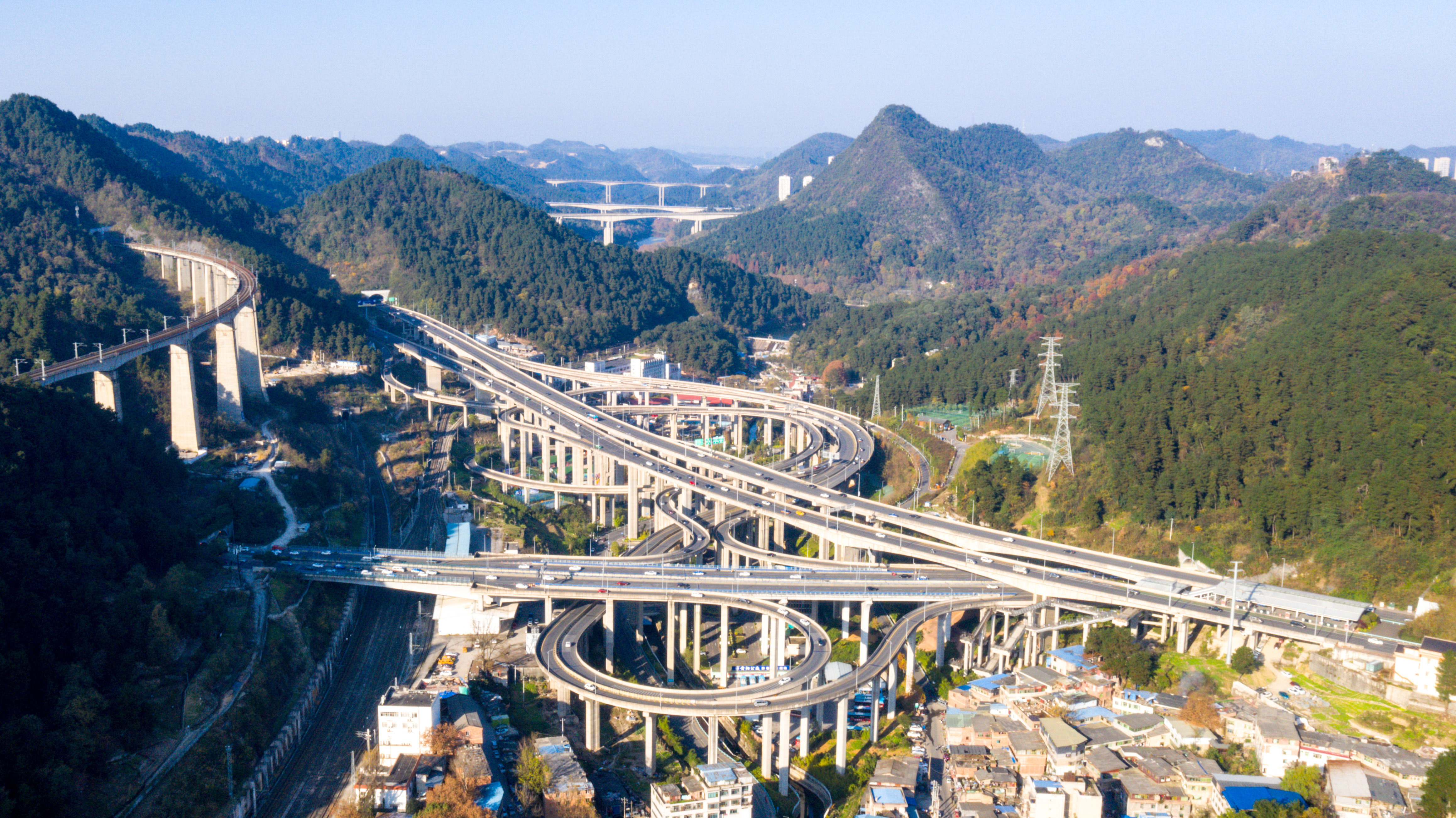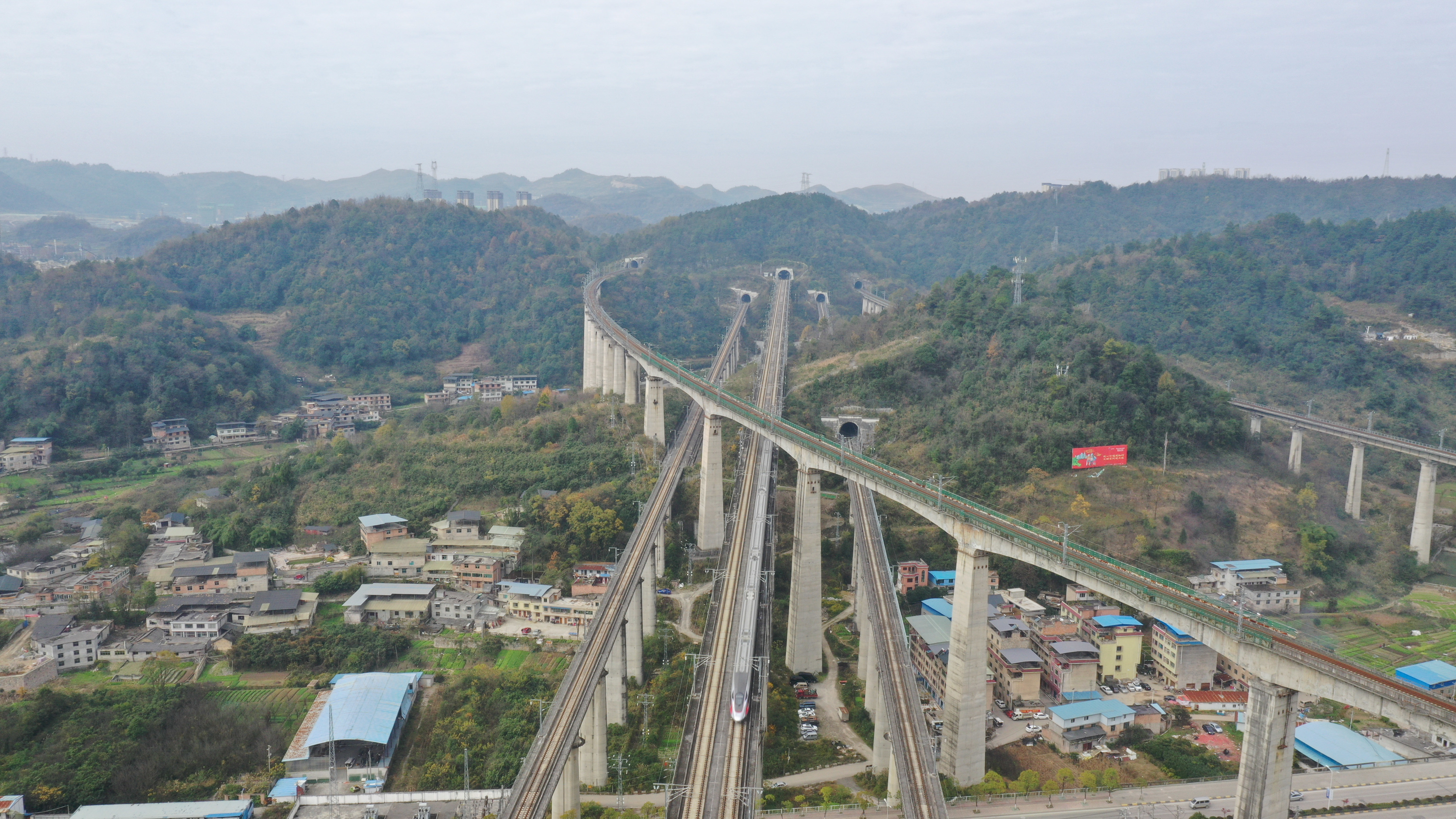 12月1日拍摄的贵阳市“五龙出海”景观。在贵阳市乌当区,高铁沪昆线、贵广客运专线、贵开城际客运专线的隧道和桥梁交织在一起,形成“五洞五桥”并行的壮观景象(无人机照片)。新华社记者 欧东衢 摄