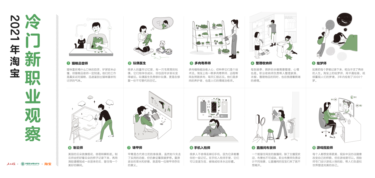 小众需求背后也有大市场。12月14日,淘宝联合工人日报融媒体中心、中国劳动关系学院劳动教育学院共同发布了《2021年淘宝冷门新职业观察》,对2021年度出现的新鲜冷门的职业进行集中盘点。其中包括玩偶医生、绘梦师、多肉寄养师、游戏捏脸师、整理收纳师、制云师、猫粮品尝师、铸甲师、直播间布景师、手机入殓师等十个职业。