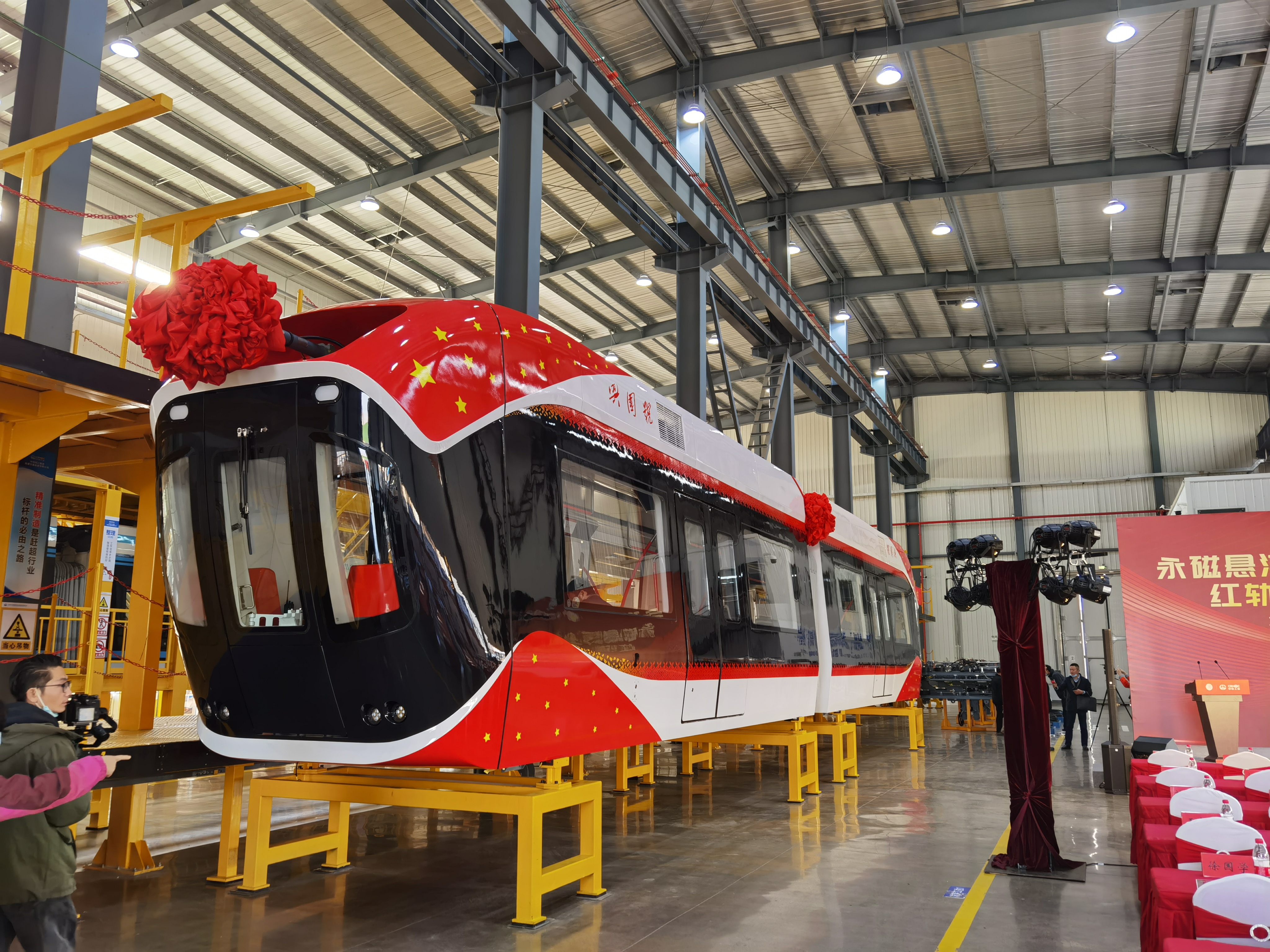 由江西理工大学、中国中铁工业下属中铁科工集团有限公司联合研制的国内首列磁浮空轨车辆“兴国号”14日在武汉下线,将应用在江西兴国永磁磁浮技术工程示范线上。