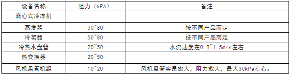hd/hf值,小型住宅建筑在1~1.5之间大型高层建筑在0.5~1之间,远距离输送管道(集中供冷)在0.2~0.6之间。设备阻力损失见下表。