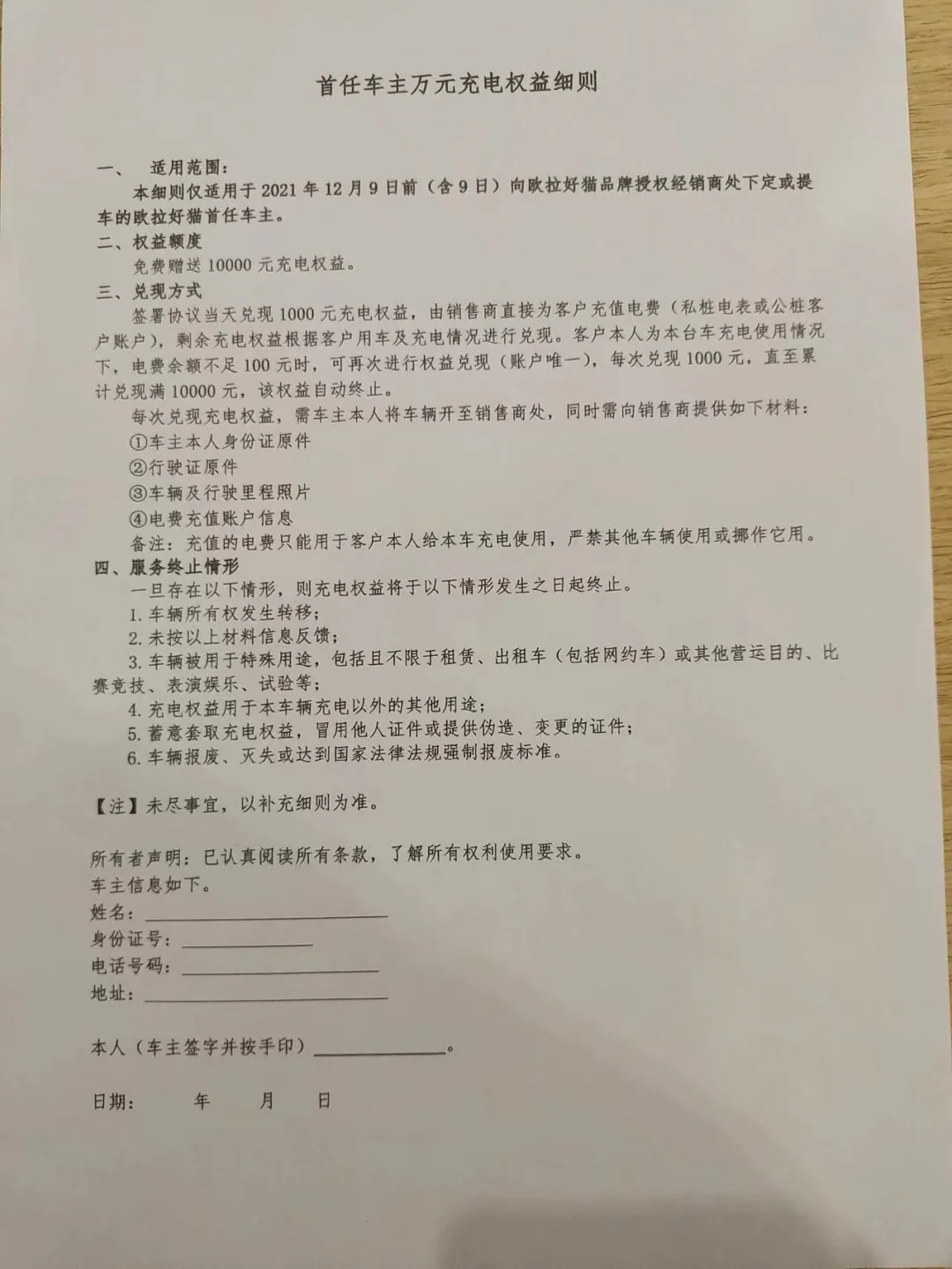 从车主公开的的补偿细则来看,欧拉在权益使用方面设定了非常多的约束条件,比如限制首任车主使用,限制本车使用,营运车不在补偿范围等等。同时,1万元并不是全额一次性充值到用户的充电账号中,而是1000元充一次,用户账户余额不足100元以下时,需要去4S店申请充值,总计充值10次。另外,申请充值时,需要提交身份证、行驶证、车辆和里程照片等等。