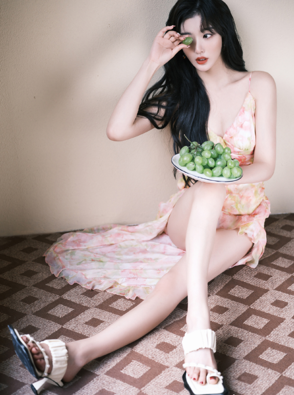 另一张照片中,只见孔雪儿端着葡萄穿着白色的凉鞋,双腿交叠坐在地毯上,露出白皙细长的双腿,乌黑的长发垂落在胸前,配上精致的妆,十分的性感迷人。她拿起一个葡萄挡住右眼,姿势非常的俏皮。