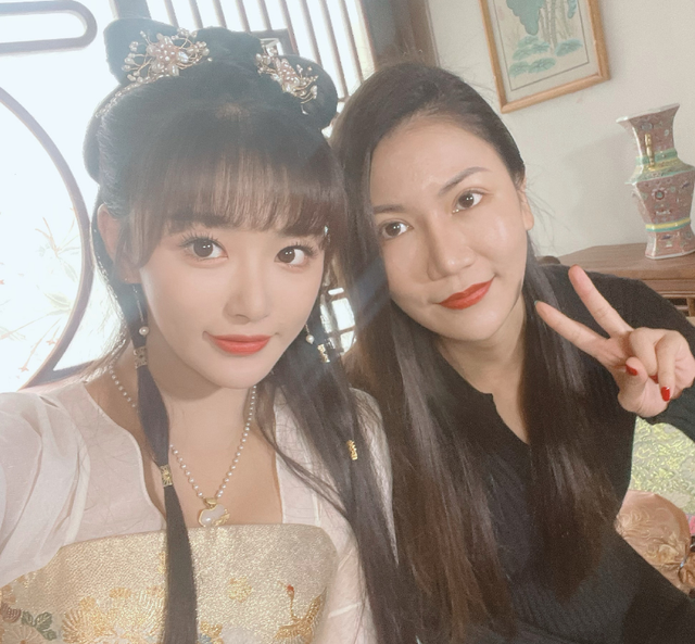 古装的孔雪儿梳着两条小辫子和齐刘海,头上戴着一些小巧精致的发饰,一双大眼睛亮晶晶地盯着镜头,穿着粉色齐胸襦裙,显得整个人非常的可爱灵动。