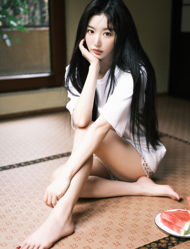 这张照片中,孔雪儿穿着纯白的T恤和短裤光着脚坐在竹席上,露出一双白皙的长腿,黑色的长直发凌乱的披散在肩头,化着淡淡的妆容,加上身旁的一盘西瓜,整个人非常的干净清纯,像邻家小女孩一般。
