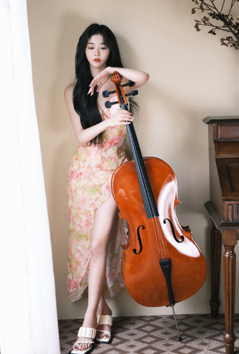 下一张图片不同于上面的性感,孔雪儿撑着大提琴交,叉着双腿伫立在落地窗旁,收腰吊带显出细窄的腰,高开叉的裙子露出一条白皙的长腿,配合上复古的不经,显得十分的优雅。