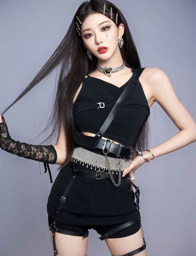 舞台上的孔雪儿一袭黑色气场全开,短款上衣裤子配上制服式的皮带装饰,加上耳朵脖子上的银色金属首饰,以及黑色眼妆外挑的眼线,造型又酷又飒。