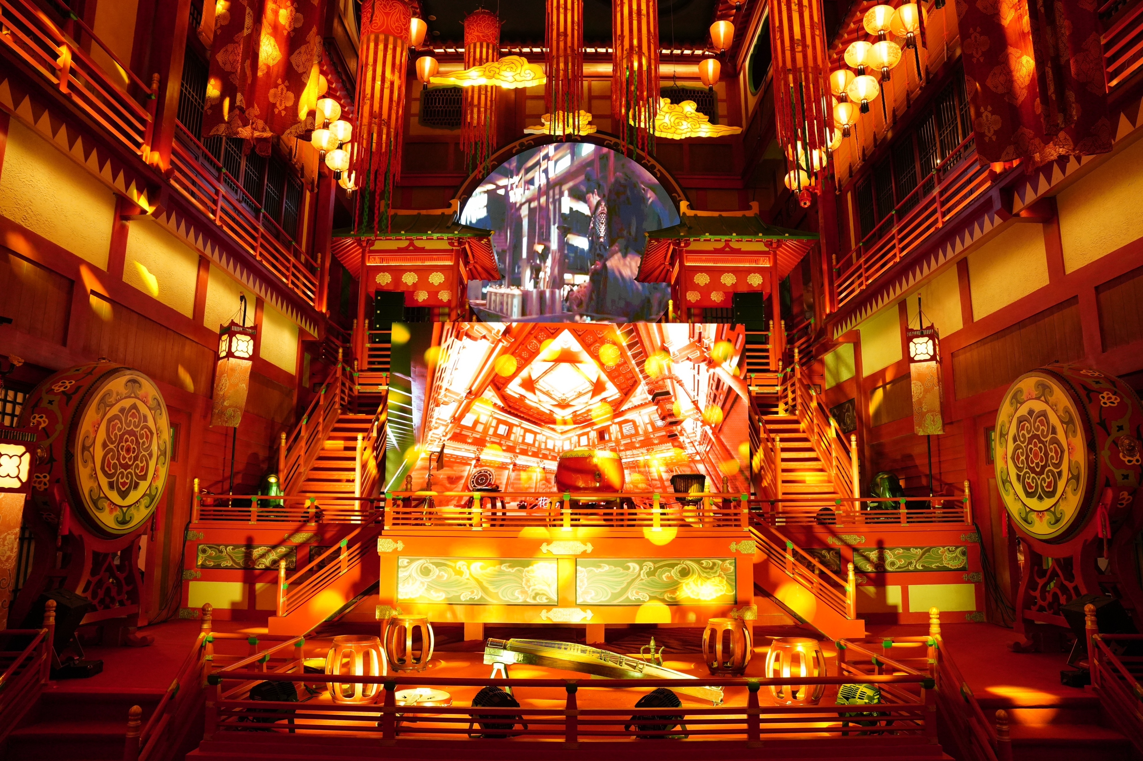 “长安十二时辰”全唐市井文化生活体验地项目覆盖曼蒂广场三层空间,通过百戏馆、踏歌台、乐游园等唐风建筑,杏仁酪、上元油锤、五香饮等长安饮食,投壶、双陆、傩戏等唐风娱乐活动,全方位、多角度展现了唐长安城的市井生活魅力。项目内有南北两处大中庭,南侧中庭名为“花舞大唐”,北侧中庭名为“通善人间”,集有日晷、吉凤、红龙、太上玄元灯、花萼相辉楼、望楼、靖安司等《长安十二时辰》剧集中的场景设计。据悉,项目邀请了《长安十二时辰》的美术置景团队作为施工顾问,被剧集粉丝们津津乐道的靖安司沙盘、日晷、望楼等道具场景将被完全的复制和复原。其中,南侧中庭的“花舞大唐”最为出彩,场景布置还原《长安十二时辰》中许鹤子上元节花车斗彩巡游的场景,将原有两层空中连廊巧妙利用,充分发挥三层中空的立体空间,营造一处公共演艺舞台,既符合现代商业公共空间设定,又营造出影视剧中灿烂夺目的舞台效果。丰富的唐风立体装饰营造出强烈的视觉冲击力,给人一种独特的审美体验,公共演艺平台更是将唐长安各色曲艺舞蹈集中呈现。在“花舞大唐”舞台上,将上演霓裳羽衣舞、凌波舞和傀儡戏等演艺,再现繁华长安的舞蹈曲艺魅力。从宫廷到民间,自舞蹈至曲艺,各色唐代艺术集萃于这一舞台,组合成一场精彩的唐长安视听盛宴。