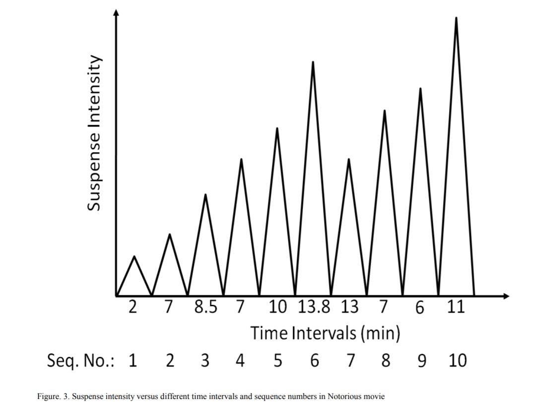 这张图显示:在看这部电影的过程中,观众的焦虑每过 2-13 分钟不等会被唤起一次。唤起焦虑的上升过程对应的其实就是疑点的发掘过程,顶峰后落下的片段对应的就是疑点的解决过程。