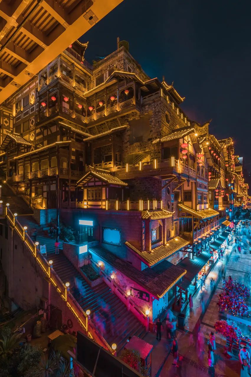 到了夜晚开启灯光,洪崖洞就变身为一个魔幻的世界,和白天的洪崖洞相比完全是两个模样。